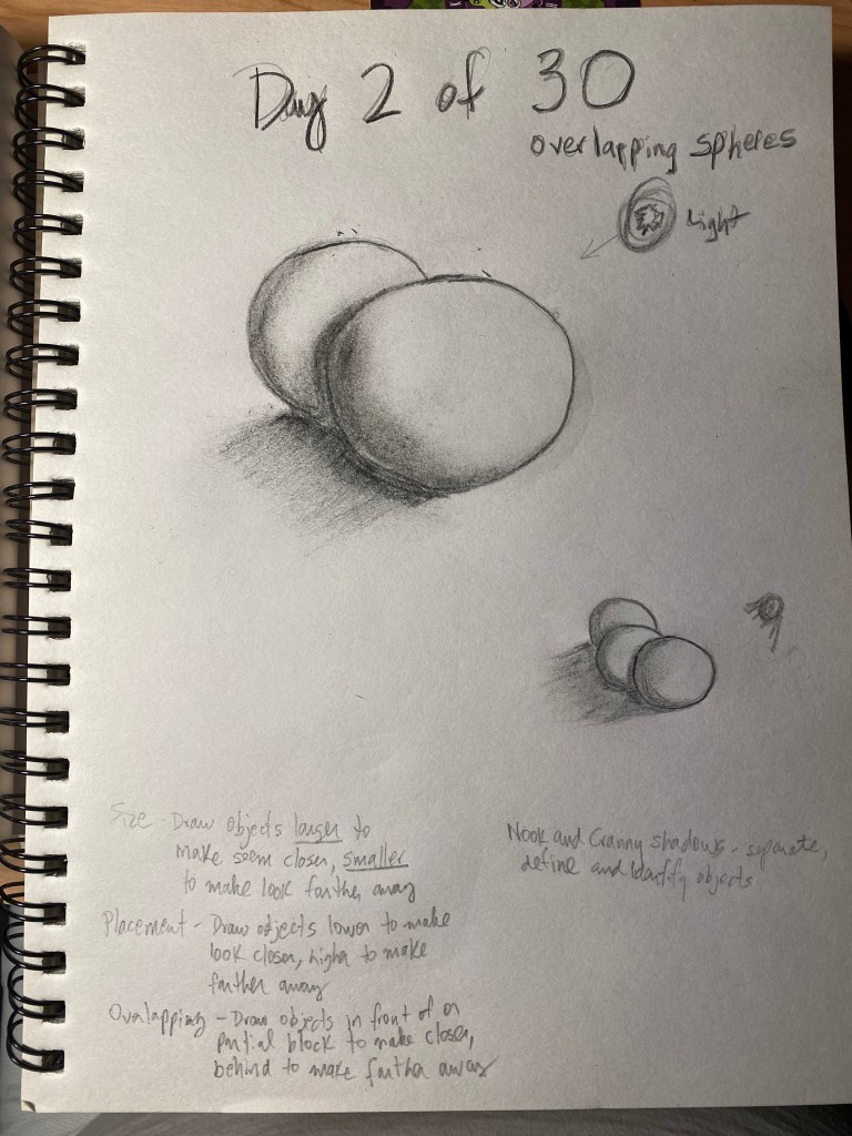 Third day of drawing but second day of lessons (first day was a pre-test drawing). Tonight’s lesson expanded on the sphere and use of shading, but using overlapping spheres to introduce 3 Laws of Drawing.
