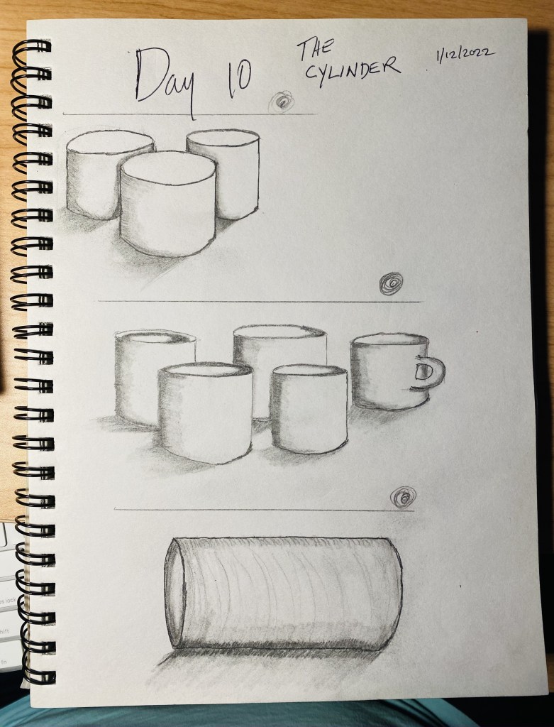 1/3 of the way through this challenge/adventure. Day 10 was THE CYLINDER. Getting the basics down. Again, lots of shading to try and make things look 3D on a 2D piece of paper.