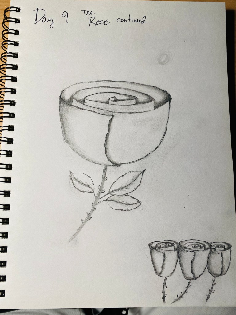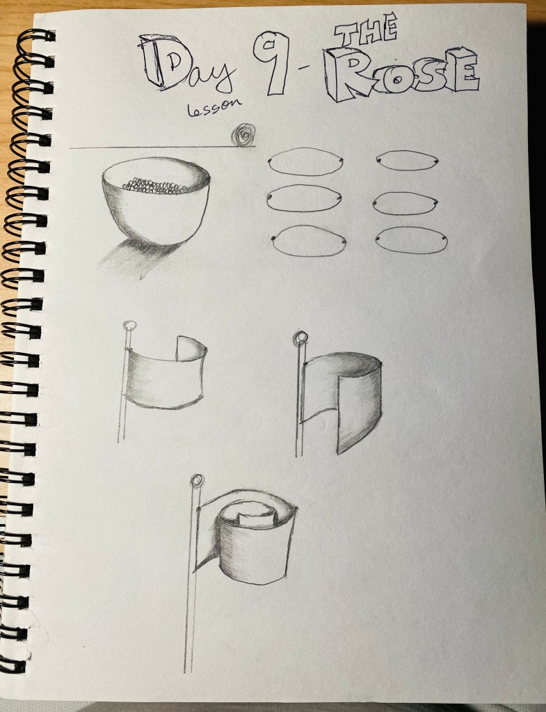 This lesson was The Rose. This lesson took at least an hour to complete. There was some pre-drawing practice and then the final drawing of a rose. Again, these are not life accurate drawings. They are presented to teach methods for presenting an object in 3D space. So that when you do want to do something a bit more realistic you can.