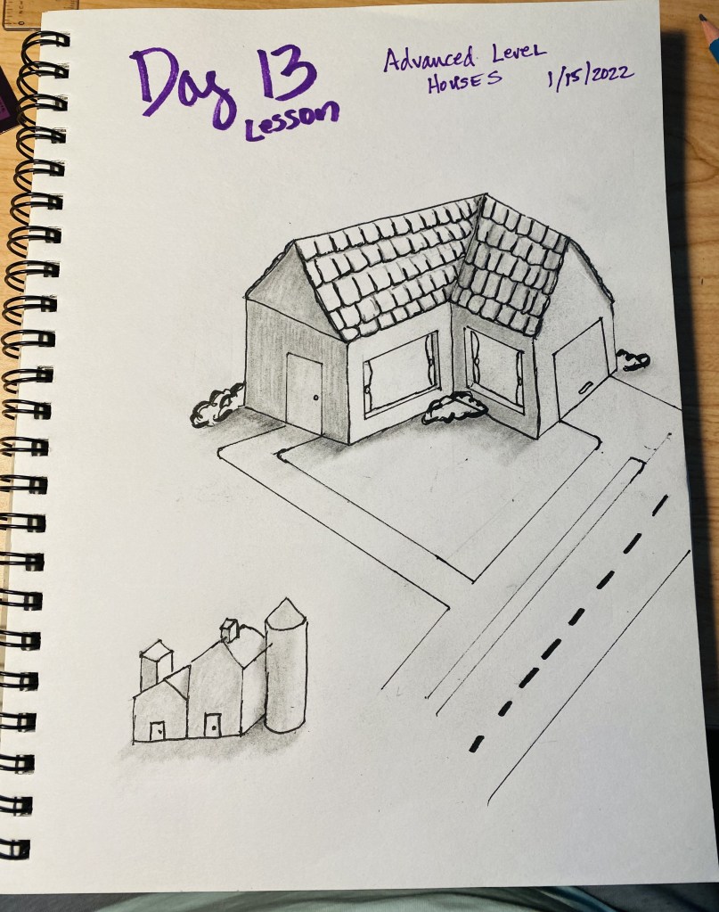 Day/Lesson 13. Not gonna lie, this was hard. It was just simple cubes but trying to get the foreshortening perspective working was tough when combining into a simple house. I’ve got a mountain of eraser shavings from the constant re-drawing of lines to try and get the perspective correct. I don’t think I figured it out fully. This is an area I’m going to have to practice more. going to tray and get a second lesson in today (Saturday) as I work to get caught up and finish at the end of January.