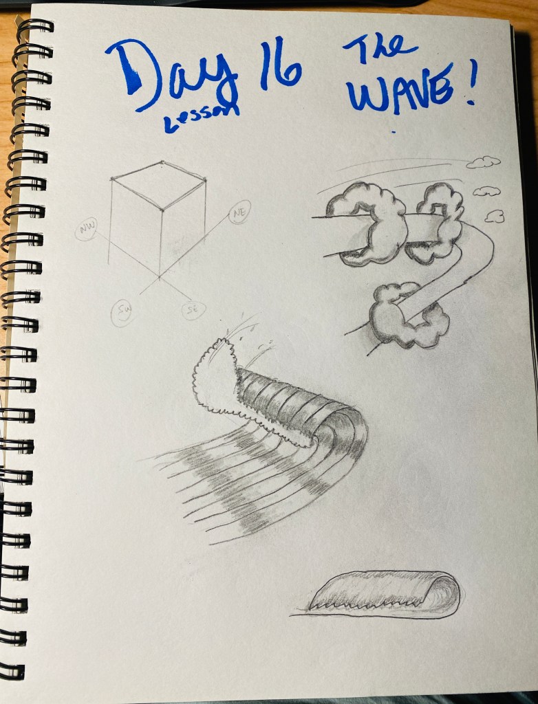 Day/Lesson 16 – The Wave. Using curling contours, tonight’s lesson was to draw a wave. This brought back memories of me drawing a crashing wave (bottom right) all over my school notebooks when I lived in Puerto Rico and was into surfing. I would usually add the tip of a surfboard sticking out from the curl. That was decades ago during a simpler carefree time.