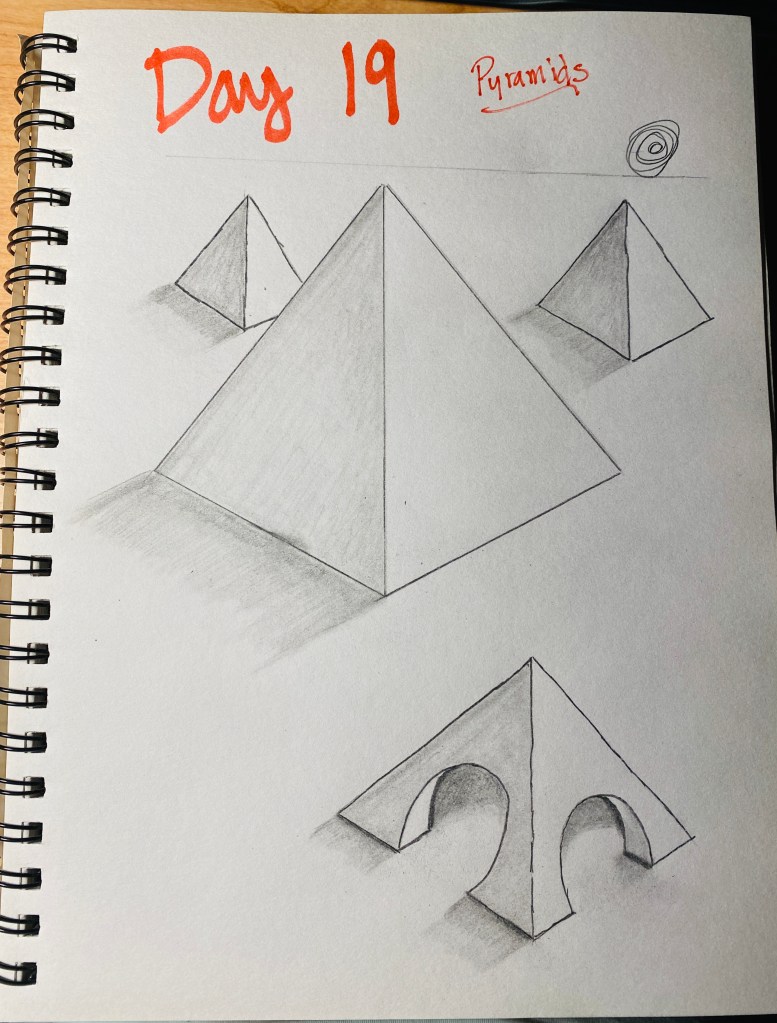 Walk like an Egyptian. This Day/Lesson 19 was The Pyramid. And shading. Cause you know… its hot in the shade, in the desert, where pyramids are. This was a fun draw, probably because I like straight lines and hard shapes more than circles and spheres. Easier shading.