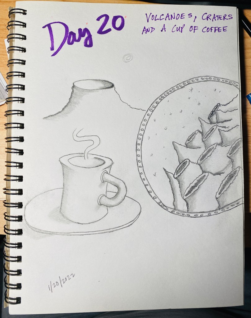 Day/Lesson 20 – Volcanoes, Craters and a Cup Coffee. This was a fairly enjoyable draw and kept me busy for an hour. More foreshortening of circles and shading. How’d I do?