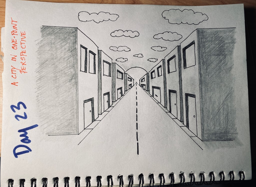 Continuing with the one-point perspective, today’s Lesson 23 was A City in One-Point Perspective. Like the other lesson, I enjoyed this one as well. I added a sunset and clouds to enhance the sketch. I also turned the sketch pad sideways to get a wider view.