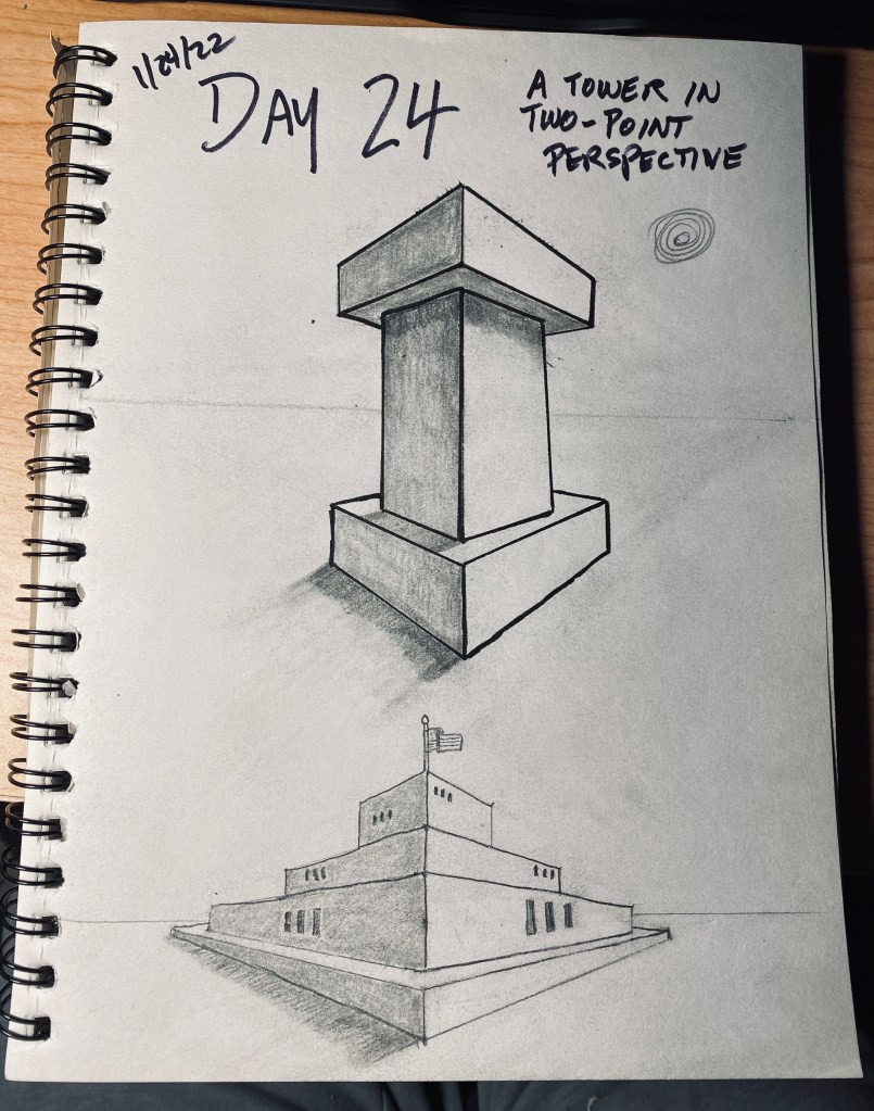 Day/Lesson 24 – A Tower in Two-Point Perspective. Taking a step deeper into perspective, tonights drawing is using two perspectives on the horizon line. Pretty cool. Enjoyed this one.