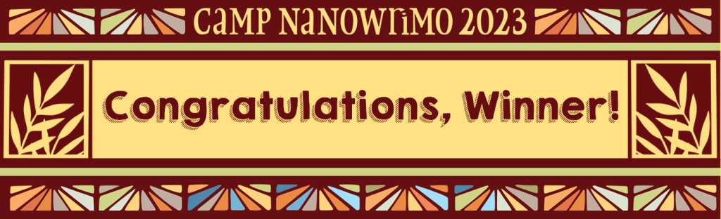 I did it! I set a goal and delivered on that goal. If you remember my previous post from July 10, I announced my participation in July’s Camp NaNoWriMo. I’m not going to rehash what it’s all about, suffice it to say I set a goal to write 20,000 words during the month of July and I met and surpassed that goal. I actually hit my goal on July 27, four days before the end of the month (today). I averaged around 725 words per day. Some days it was easy and I would hit 800+ words, some days it was tough to eke out the 645 words I needed to make the goal. I only missed two days out of the 31 days of July. I wrote 22,706 words during the month of July.