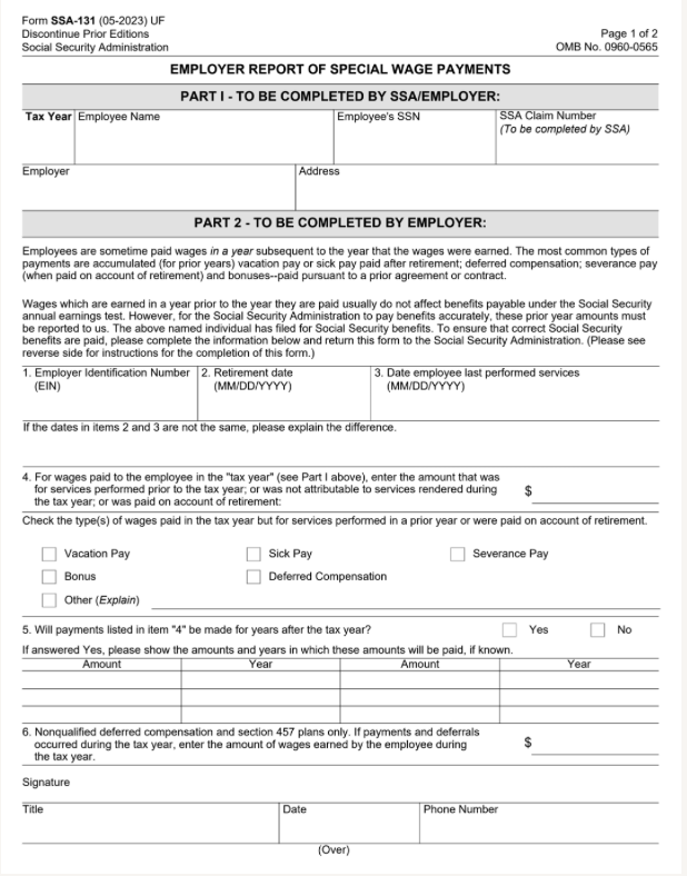 After making the 30 minute drive to the SSA office, and waiting for 35-40 minutes I was told that I needed a form SSA-131 for the issue. At no fault of mine, the SSA folks withheld information in February 2024 regarding the need for a form SSA-131 to be completed by my former employer stating that the income I received in 2024 (January to be exact) was payment for work performed in 2023, prior to my retirement date of December 31, 2023. Otherwise, the SSA was planning on taking back $1700 from me. This is a year and a half later!! WTF?? I was not happy.